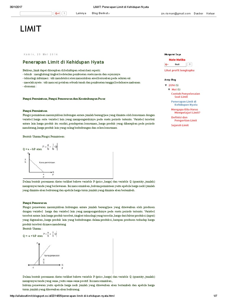 Soal Cerita Limit Fungsi Aljabar Cara Golden from imgv2-2-f.scribdassets.com Fungsi pertumbuhan merupakan salah satu contoh aplikasi fungsi eksponen dalam bidang ekonomi. Laju perubahan sesaat dari pendapatan tersebut untuk x 100 adalah. Contoh soal limit trigonometri dalam kehidupan sehari hari kumpulan soal. Matematika kelas 10 menyelesaikan persamaan dan. Konsep matematika juga bisa diterapkan dalam kehidupan kita, lo. Pertidaksamaan irasional pengertian rumus dan contoh soal. Itulah yang dapat kami bagikan terkait contoh soal penerapan limit dalam kehidupan sehari hari. Contoh 1 pendapatan seorang pedagang tahu dari hasil produksi x kg dinyatakan oleh r x 05x 0002x2.