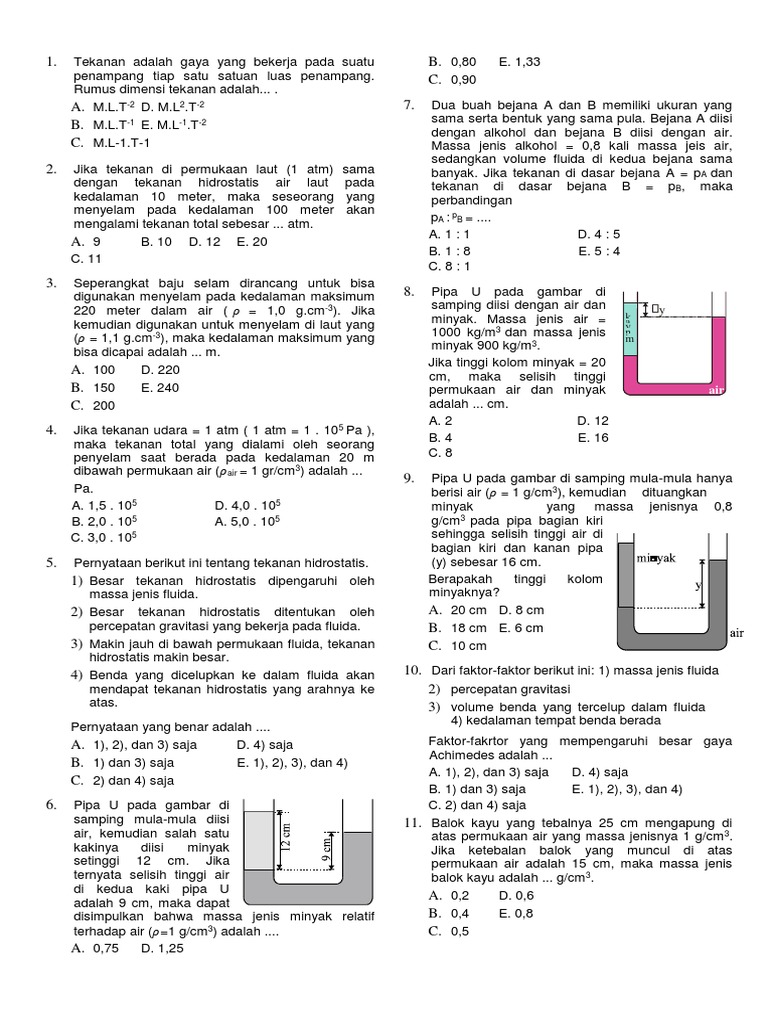 Contoh soal tekanan hidrostatis dan contoh soal tentang gaya archimedes, contoh soal tentang hukum pascal yang disajikan dalam beberapa jenis soal seperti grafik, soal. Misalkan, pada suatu pipa u dimasukkan dua jenis fluida yang massa jenisnya berbeda, yaitu ρ1 dan ρ2. Jadi, yang termasuk ke dalam fluida adalah zat cair dan gas. Gas mudah dimampatkan, sedangkan zat cair tidak dapat dimampatkan. Pada salah satu sisi diisi dengan minyak sebanyak 9 cm.